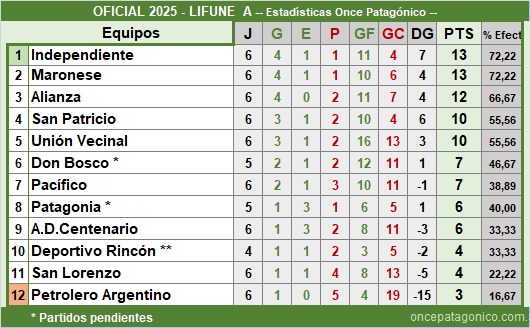 El domingo, en el horario central de las 16, se disputará la séptima fecha con los cruces: Independiente – San Lorenzo, Maronese – Centenario, Pacífico – Alianza, Patagonia – San Patricio, Petrolero – Deportivo Rincón y Don Bosco – Unión Vecinal.