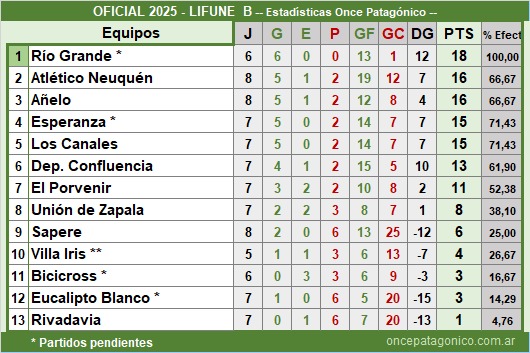 En la B, Río Grande goleó 4 a 0 a Eucalipto y es el líder con puntaje ideal y dos partidos menos. Ganó sus 6 encuentros con 13 goles a favor y solo uno en contra.