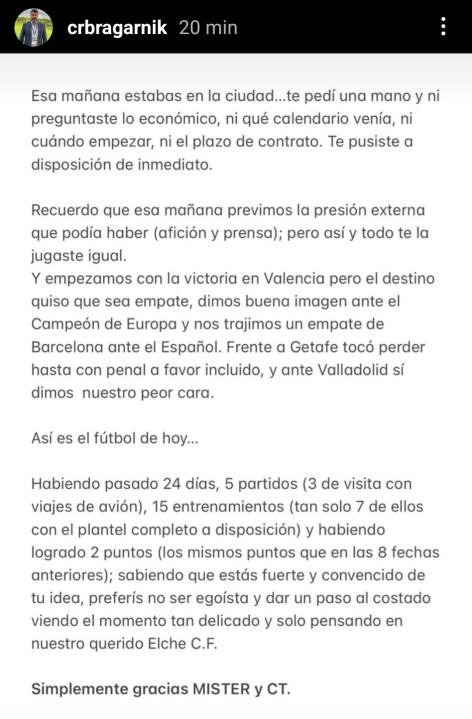 Por otro lado, el accionista mayoritario del club ilicitano, Christian Bragarnik, agradeció a Almirón a través sus redes sociales y destacó de él que pese a ser «fuerte y estar convencido de su idea» prefiera «no ser egoísta y dar un paso al costado viendo el momento tan delicado y pensando solo» en Elche.