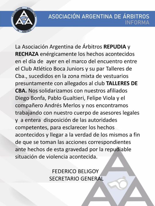 “La Asociación Argentina de Árbitros REPUDIA y RECHAZA enérgicamente los hechos acontecidos en el día de ayer en el marco del encuentro entre el Club Atlético Boca Juniors y su par Talleres de Córdoba, sucedidos en la zona mixta de vestuarios presuntamente con allegados al club Talleres de Córdoba«, redactaron en su comunicado.