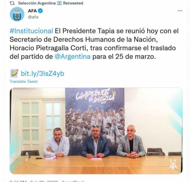 El presidente de la AFA, Claudio Tapia, acompañado por unos de los Vicepresidentes de la institución, Marcelo Achile, mantuvo una reunión con el secretario de Derechos Humanos de la Nación, Horacio Pietragalla Corti, luego de confirmarse el traslado del partido de la fecha de Eliminatorias Sudamericanas rumbo a Qatar 2022 del 24 de marzo al viernes 25.