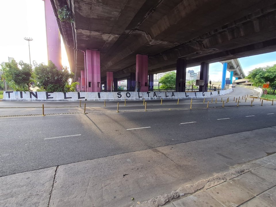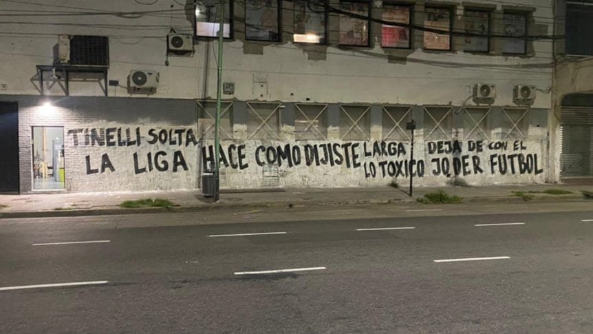 «Tinelli: soltá la Liga, hacé como dijiste, largá lo tóxico. Dejá de joder con el fútbol», fue el mensaje escrito durante la madrugada sobre un paredón de la porteña Avenida San Juan al 1.100, en los alrededores de Canal 13, a la altura del Puente Pueyrredón.
