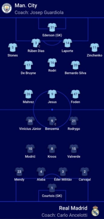 El anfitrión sufrió algunas bajas en defensa como Walker y Joao Cancelo, mientras que Casemiro fue al banco en la visita por una molestia. Los ingresos a las formaciones titulares de John Stones en el City y Rodrygo en el Madrid tuvieron su impacto.