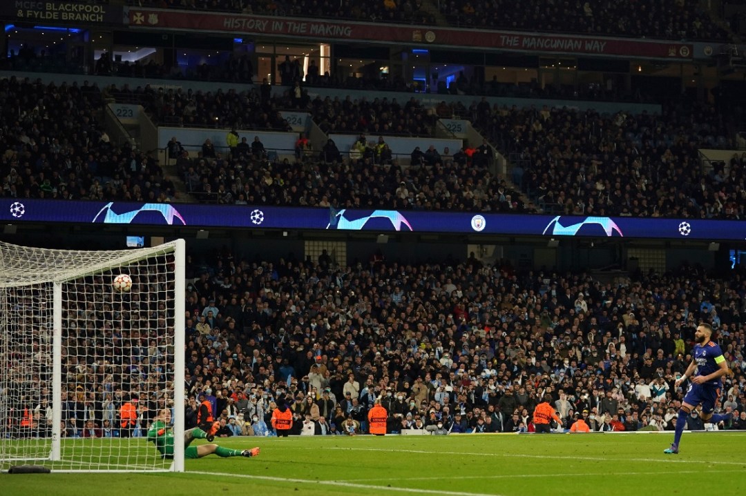 Pero los respiros no existieron en la noche de Manchester. Con una pelota parada a los 35′, el Real logró el tercer descuento. Una clara mano en el área fue sancionada como penal por Kovacs, a instancias del VAR, y Benzema la picó ante Ederson, en otra evidencia de su absoluta calidad.