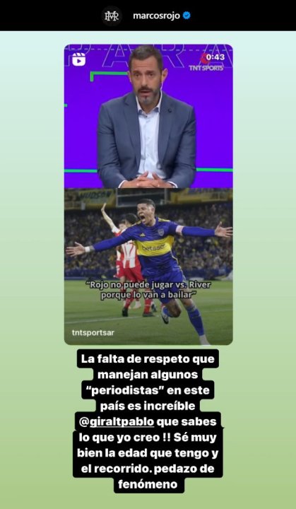 Rojo no se quedó callado y salió a responderle en una historia de Instagram. «La falta de respeto que manejan algunos periodistas en este país es increíble», escribió y luego arrobó al periodista.