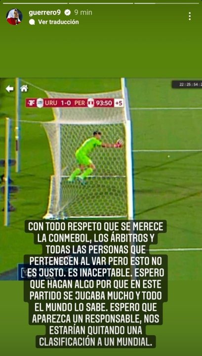 Uno de los que mostró su enojo y pidió a las autoridades que se tomaran cartas en el asunto fue Paolo Guerrero. El ex delantero de la selección de Perú compartió una imagen en la que claramente se ve la pelota adentro del arco. «Con todo respeto que se merece la Conmebol, los árbitros y todas las personas que pertenecen al VAR, pero esto no es justo. Es inaceptable. Espero que hagan algo porque en ese partido se jugaba mucho y todo el mundo lo sabe. Espero que aparezca un responsable, nos estarían quitando una clasificación a un Mundial».