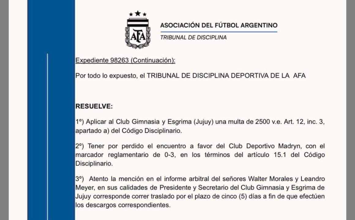 El tribunal de disciplina de AFA publicó el fallo del partido suspendido entre Gimnasia de Jujuy y Deportivo Madryn por presuntas amenazas al árbitro, Lucas Comesaña, en el entretiempo.