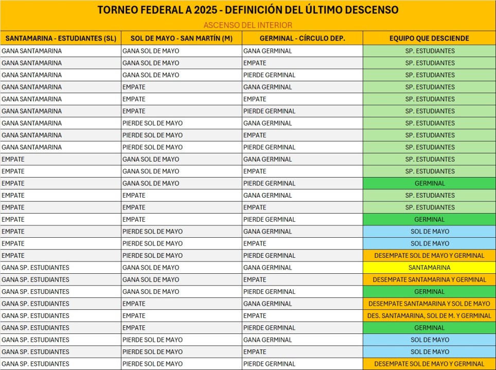 Cuatro combinaciones de resultados mandarían a los rionegrinos al descenso. En todos esos escenarios debería perder y que Estudiantes de San Luis o Germinal ganen o uno gane y el otro empate. Si Sol empata se asegura, como mínimo, la oportunidad de jugar un desempate.