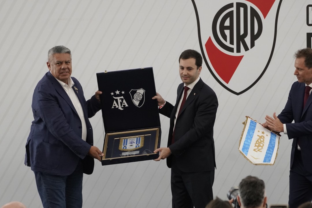 Chiqui Tapia estuvo en el acto junto al tesorero de AFA, Pablo Toviggino. Di Carlo agradeció la presencia de ambos y comentó: «Estamos orgullosos de aportar nuestro estadio para ser sede del Mundial 2030″.