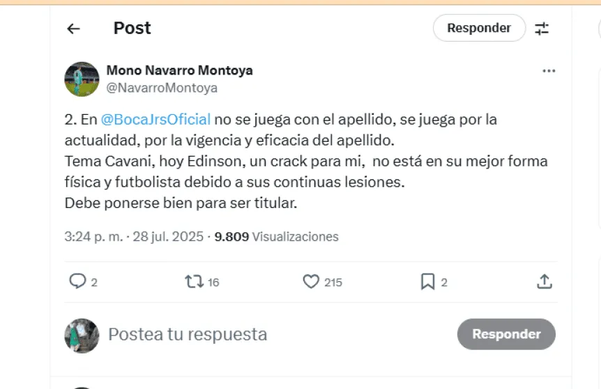 Ahora, Carlos «Mono» Navarro Montoya opinó en su cuenta de X y analizó el presente del uruguayo en el Xeneize. «En Boca no se juega por el apellido. Se juega por la actualidad, por la vigencia y eficacia del apellido. Tema Cavani, un crack para mi, no está en su mejor forma física y futbolística debido a sus continuas lesiones. Debe ponerse bien para ser titular», planteó el histórico guardameta.