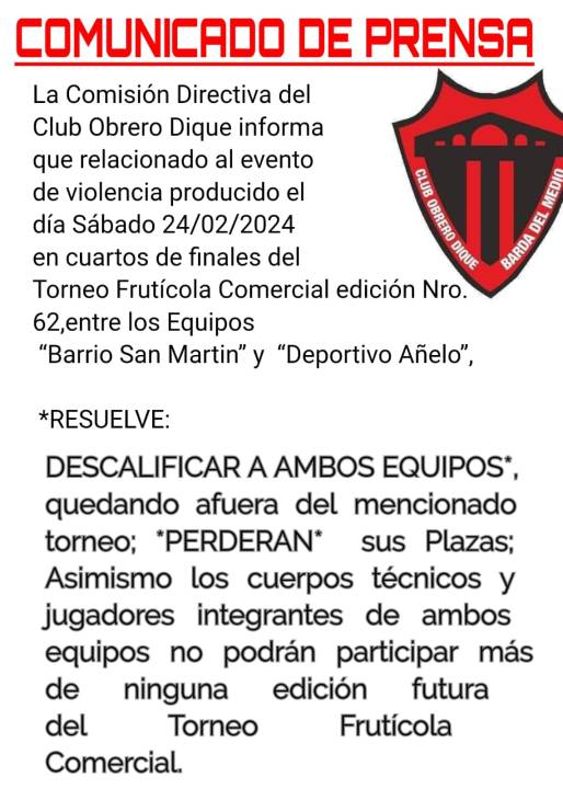 «Se revuelve descalificar a ambos equipos, perderán sus plazas. Asimismo, los cuerpos técnicos y jugadores integrantes de ambos equipos no podrán participar más de ninguna edición futura del torneo”, expresaron desde la institución de Barda del Medio.