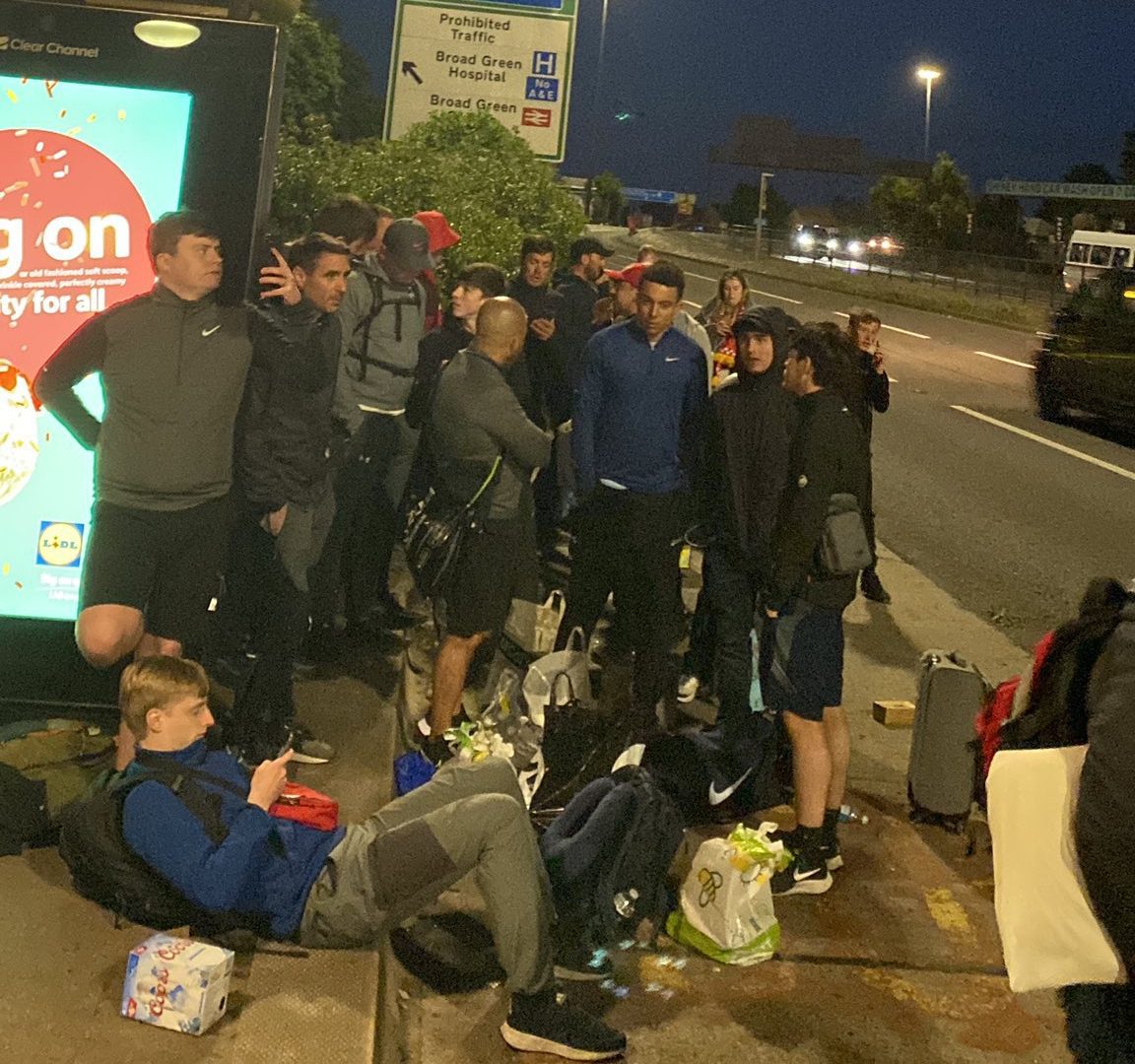 Los hinchas del Liverpool debían ser recogidos a las 16 en el Rocket Pub de la ciudad. En redes se compartieron algunas fotografías del lugar a las 22:30 y el colectivo aún no llegaba.