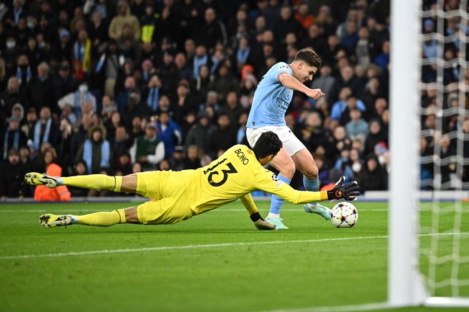Después, a los 25 minutos del segundo tiempo y con el Sevilla volcado al ataque (perdía 1 a 0 con tanto del español Rafa Mir a la media hora del primer tiempo), el belga Kevin De Bruyne habilitó a Álvarez con un pase largo para que el argentino gambeteara al arquero y definiera de zurda desde un ángulo cerrado.