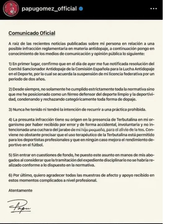 Gómez fue suspendido por “negligencia grave” tras haber consumido terbutalina, una sustancia prohibida por la Agencia Mundial Antidopaje (AMA). Luego de conocerse la noticia, el futbolista publicó un comunicado en sus redes sociales y esgrimió que tomó por error un jarabe para la tos de su hijo menor.
