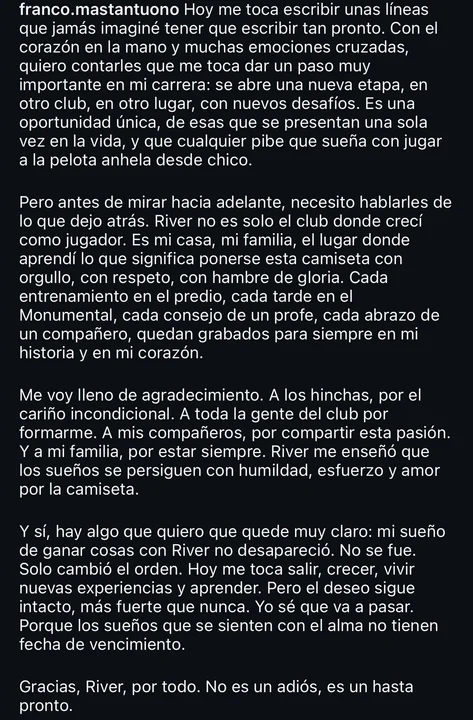 El futbolista finalmente se despidió del club de Núñez con una publicación en sus redes sociales: “Hoy me toca escribir unas líneas que jamás imaginé tener que escribir tan pronto. Con el corazón en la mano y muchas emociones cruzadas, quiero contarles que me toca dar un paso muy importante en mi carrera: se abre una nueva etapa, en otro club, en otro lugar, con nuevos desafíos. Es una oportunidad única, de esas que se presentan una sola vez en la vida, y que cualquier pibe que sueña con jugar a la pelota anhela desde chico”.
