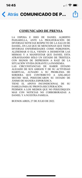 En un mensaje que fue distribuido por su abogado, Marcelo Vázquez Aguiar, «la esposa e hijo de Daniel Alberto Passarella, ante la proliferación de diversas noticias de la salud de Daniel, en las que se mencionan que tiene diversas enfermedades como Parkinson, Alzheimer o ELA, viene a desmentir las mismas y a manifestar que Daniel está atravesando sólo un estado de tristeza con signos de depresión a raíz de la situación vivida por la pandemia», aseguró la familia del campeón del mundo en 1978 y 1986, y técnico del seleccionado argentino en el Mundial de Francia 98.