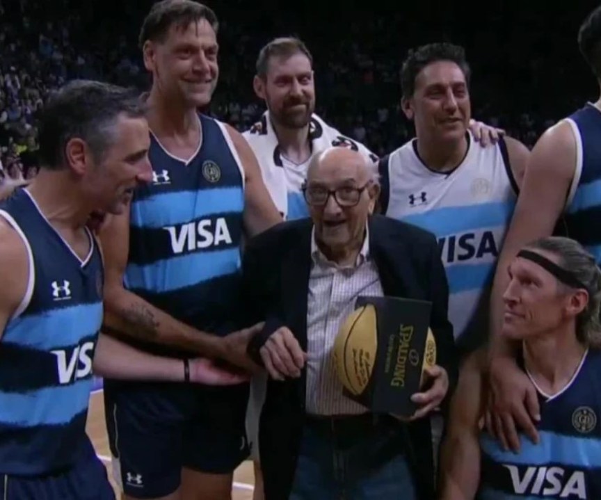 Los dorados también se dieron el gusto de jugar con sus hijas e hijos y además sorprendieron con un homenaje a Ricardo González, ni más ni menos que el capitán de la selección Argentina que se coronó campeona del mundo en el Luna Park, en 1950. A los 99 se rodeó de dorados y le dio paso a otro gran momento en el reducto porteño.