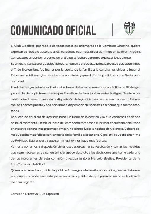 «Lo sucedido en el día de ayer nos pone un freno en la gestión y lo que veníamos haciendo hasta el momento. Desde el inicio del campeonato y desde el primer encuentro disputado en nuestra cancha nos pusimos firmes y no dimos lugar a hechos de violencia. Celebrábamos y estábamos felices con la vuelta de la familia a la cancha. Cipolletti es y será sinónimo de FAMILIA. Esta angustia que sentimos hoy nos hace más fuertes», afirmaron.