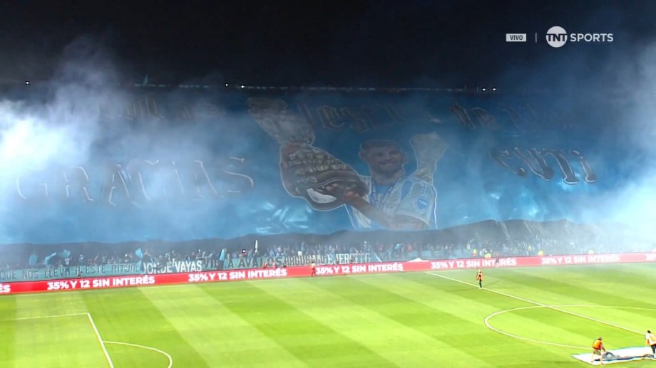En un Estadio Julio César Villagra repleto, la hinchada pirata desplegó una bandera gigante con la imagen del Cuti sosteniendo la Copa América y la Copa del Mundo, con la leyenda ‘Gracias Cuti’.