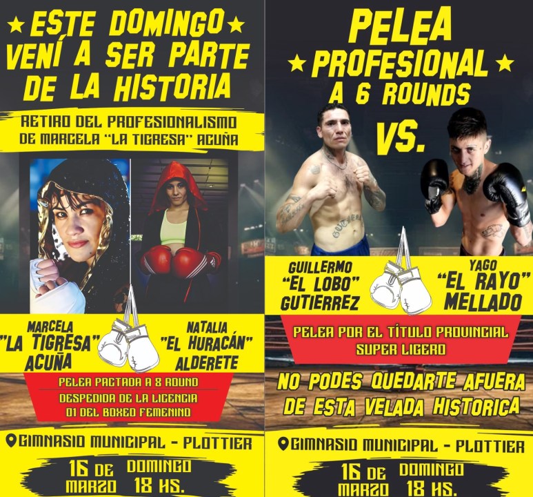 Antes de la gran pelea entre La Tigresa y El Huracán, habrá un título en juego. Guillermo El Lobo Gutiérrez, de San Martín de los Andes, se medirá con Yago El Rayo Mellado, de Zapala. Será por el provincial súper ligero y hay promesa de espectáculo, entre dos púgiles que pegan duro. La grilla final estará confirmada en las próximas horas, pero serán más de 12 combates, a partir de las 18.