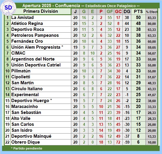 Atlético Regina venció a San Martín como visitante y aprovechó el empate de La Amistad para quedar a solo dos puntos de la cima en el torneo. La fecha 20 tuvo una polémica en Allen. Deportivo Huergo abandonó el partido ante Unión por disconformidad con el arbitraje. Los detalles.