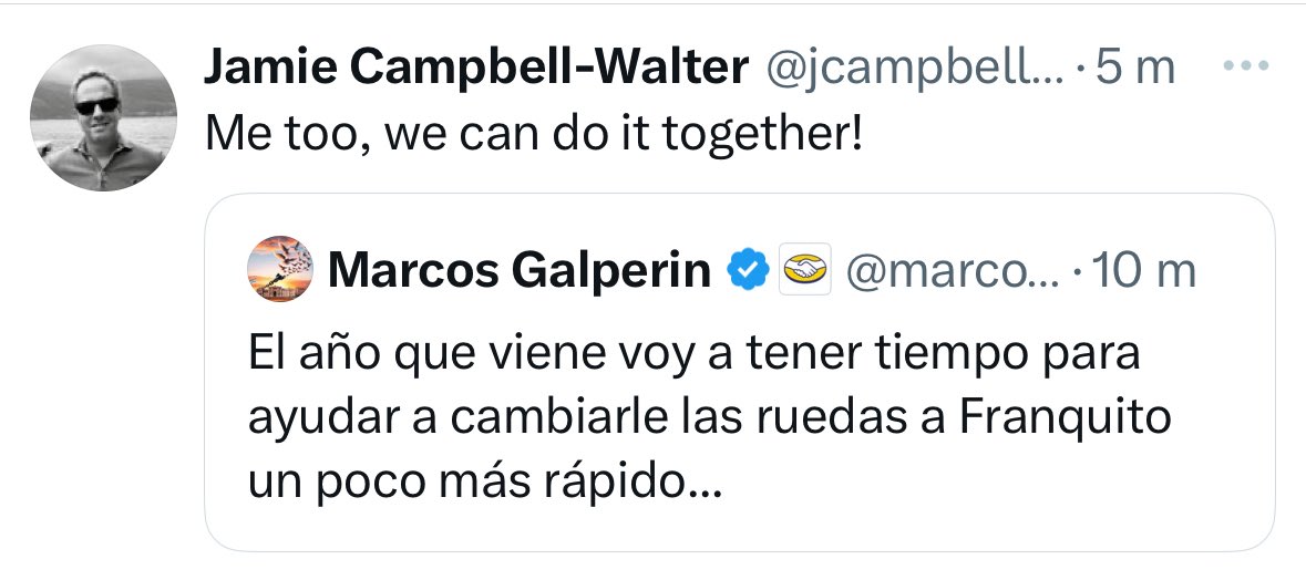 «El año que viene voy a tener tiempo para ayudar a cambiarle las ruedas a Franquito un poco más rápido…«, escribió el CEO de Mercado Libre que es uno de los principales sponsors de Colapinto en la Fórmula 1.