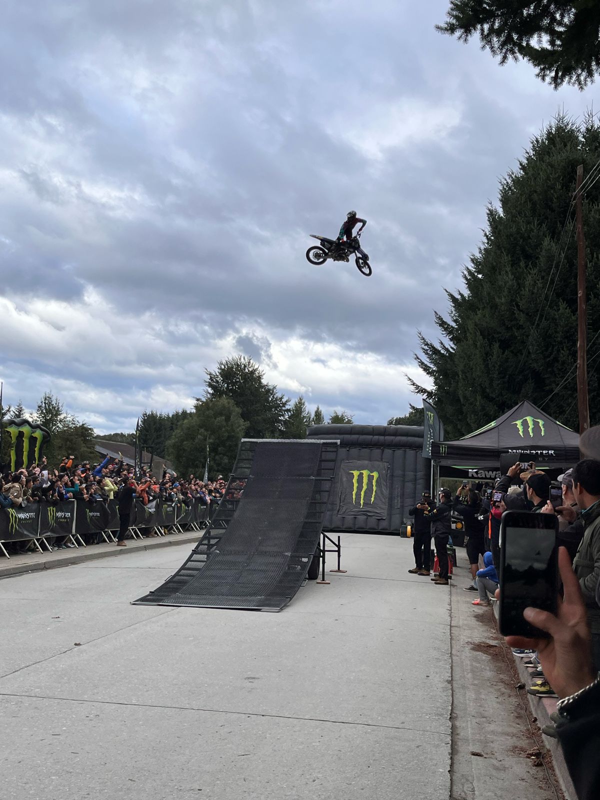 A la 18, el público dejaba las pistas para dirigirse al centro de la ciudad al freestyle motocross. Enfrente del CEF 7 de Villa La Angostura, habían montado el espectáculo. Una rampa gigante inflable, frente a ella una más pequeña de metal. Una arcada negra con el símbolo de un energizante y sobre las motos, los chilenos Marco “Chino” Gonzalez y Nicolás “Maravilla” Aravena y el seis veces campeón de Brasil, aceleraban sus motos mientras el locutor arengaba.