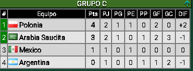 Si Argentina empata con México, ya no podrá ser primera del grupo, pero una victoria ante Polonia le permitirá clasificarse dependiendo de la diferencia de goles. Por el momento Polonia tiene dos goles a favor, mientras que Arabia está con -1.
