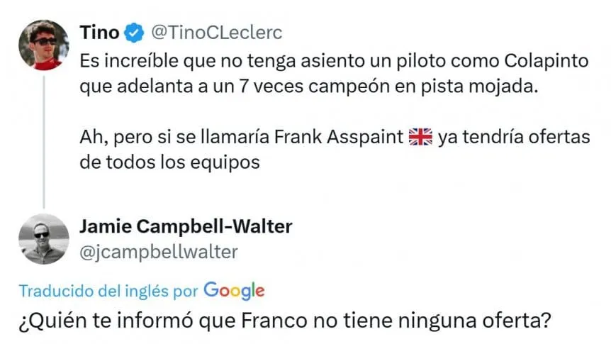«Es increíble que no tenga asiento un piloto como Colapinto que adelanta a un 7 veces campeón en pista mojada. Ah, pero si se llamaría Frank Asspaint ya tendría ofertas de todos los equipos», había planteado un usuario. Y Campbell-Walter lejos de ignorarlo, redobló la apuesta con su respuesta: «¿Quién te informó que Franco no tiene ninguna oferta?«.