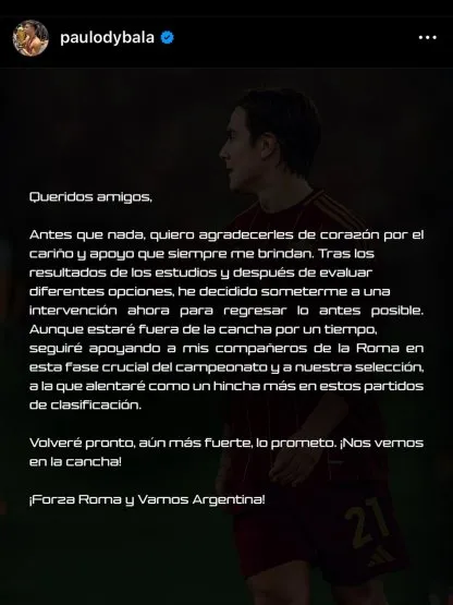 El mediapunta de la Roma, de 31 años, realizó un posteo en su cuenta de Instagram para contar la noticia y poco después el club italiano emitió un comunicado en el que dio más precisiones. «Paulo Dybala será operado en los próximos días tras una lesión en el tendón semitendinoso izquierdo.