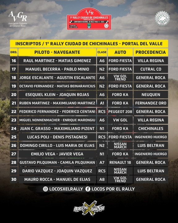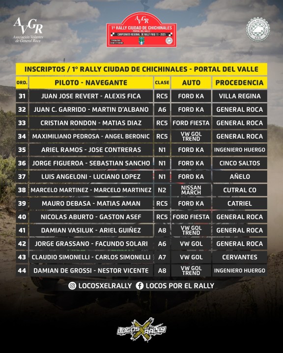 La Asociación Volantes de General Roca (AVGR) informó que son 44 los inscriptos para esta jornada clave del certamen. Como siempre será la encargada de controlar la prueba que fiscalizará la Federación Regional Once y que cuenta con la organización de la Municipalidad de Chichinales, sede de la largada simbólica, prevista para este viernes a las 20. Sin dudas, será un momento muy especial para la ciudad, que apuesta a que su fecha tenga continuidad en los próximos años.