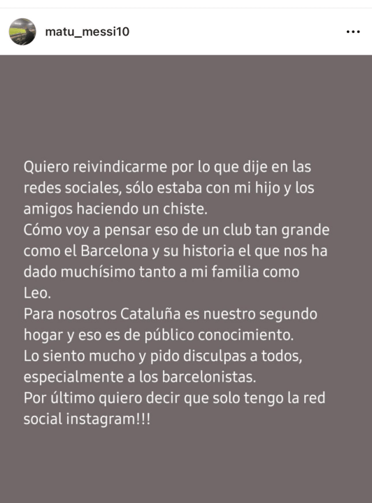 Y agregó: «Para nosotros Cataluña es nuestro segundo hogar y eso es de público conocimiento. Lo siento mucho y pido disculpas a todos, especialmente a los barcelonistas. Por último quiero decir que solo tengo la red social Instagram».