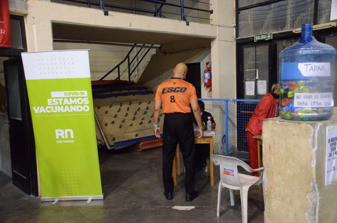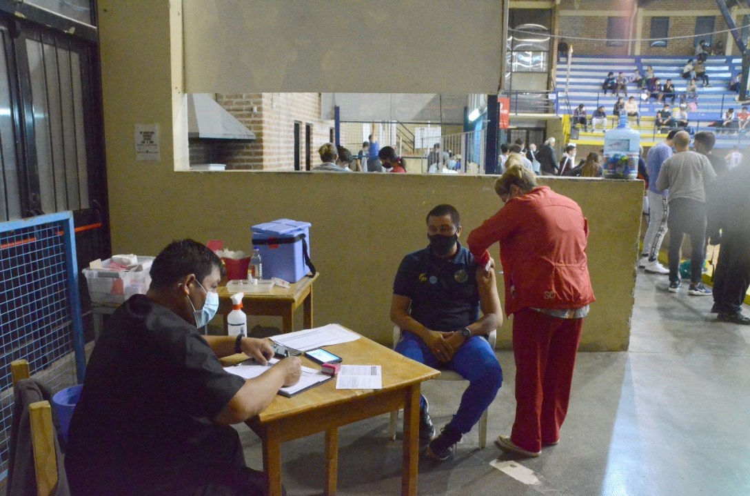 En el gimnasio, antes y durante el cotejo, personal del Hospital Francisco López Lima realizó tareas de vacunación. Pasaron por la sala improvisada chicos, adultos y adultos mayores.