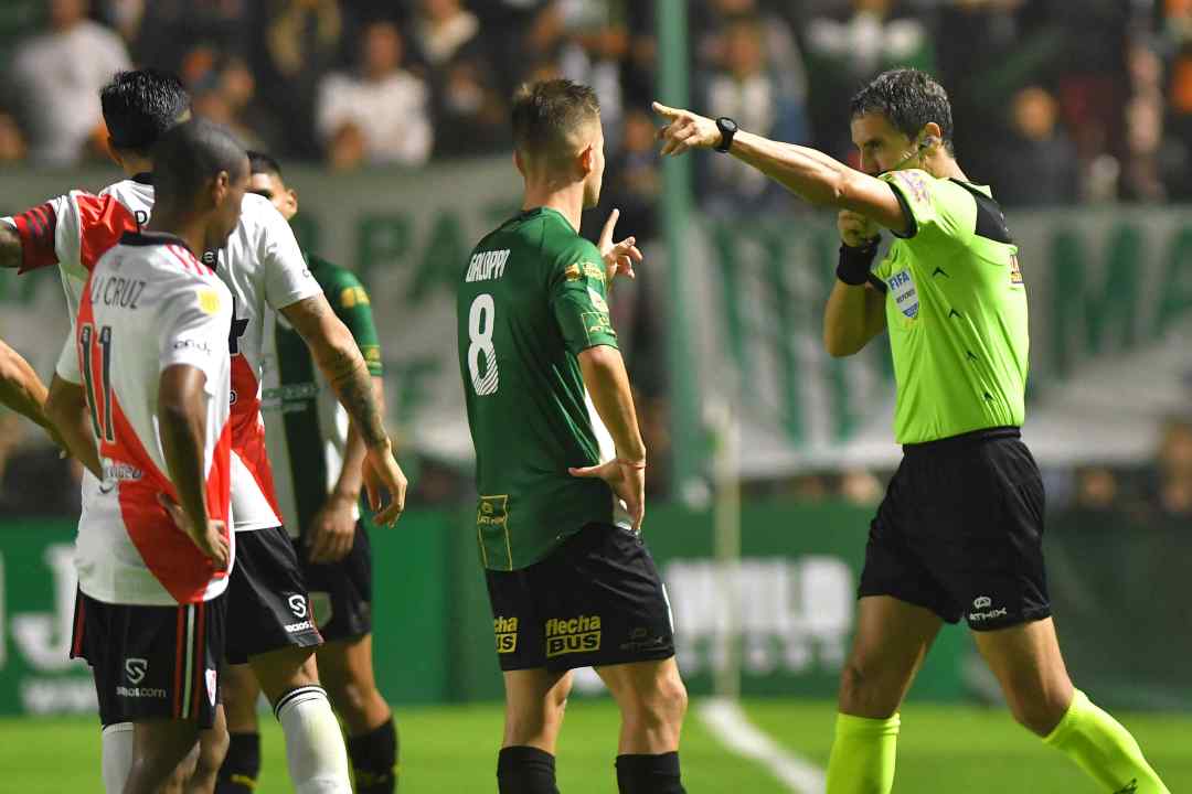 River protestó, el VAR intervino y el árbitro Pablo Echavarría fue a revisar la jugada. Desestimó la jugada casual y sancionó penal que Enzo Fernández transformó en el 1-1.