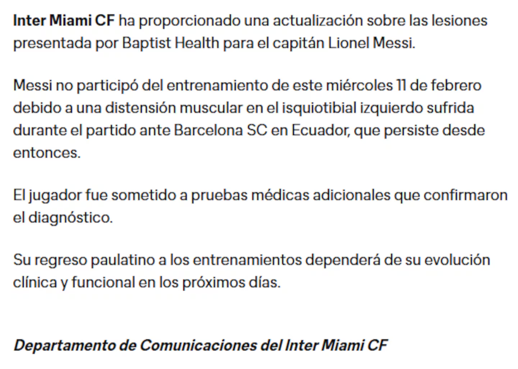 “Messi no participó del entrenamiento de este miércoles 11 de febrero debido a una distensión muscular en el isquiotibial izquierdo sufrida durante el partido ante Barcelona SC en Ecuador, que persiste desde entonces”, confirmó el club en un comunicado.