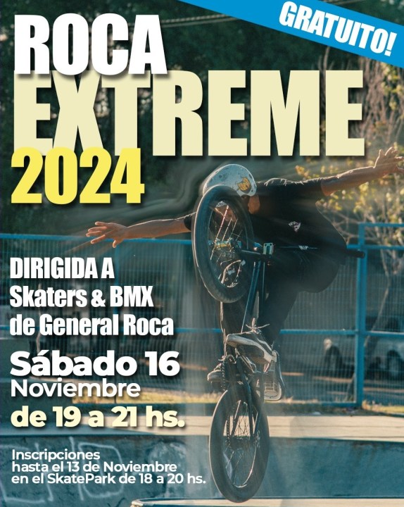 La Dirección de Deportes del Municipio de General Roca llevará adelante la competencia de Skate y BXM denominada «Roca Extreme 2024». El evento se llevará a cabo el próximo sábado 16 de noviembre de 18.30 a 21.30 hs en el Skate Park, ubicado en la zona del paseo del Canal Grande.