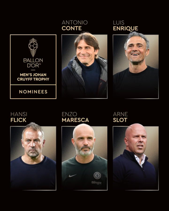 Los cinco finalistas son: los italiano Antonio Conte y Enzo Maresca, el español Luis Enrique, el alemán Hansi Flick y el neerlandés Arne Slot.