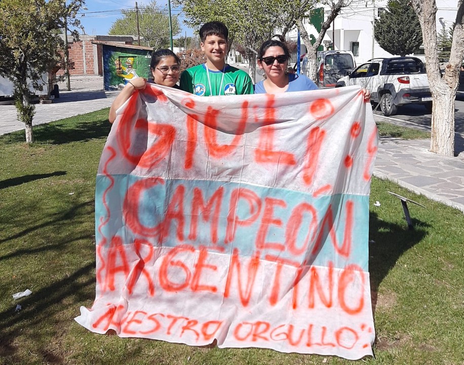 Este lunes, durante las primeras horas de la tarde, Guiliano Martínez Palmes fue recibido por familiares y un nutrido grupo de pelotaris del Club Huahuel Niyeo, en su arribo a Jacobacci.