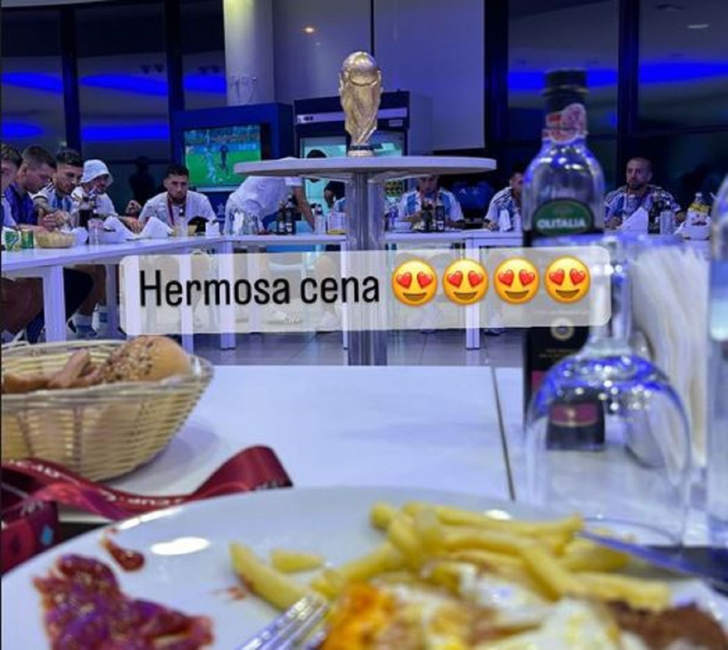 El detalle más llamativo de las publicaciones que los jugadores compartieron en las redes sociales no fue tanto el menú, sino el centro de mesa: la Copa Mundial. El trofeo mide 36,8 centímetros de altura y está hecho con 5 kilos de oro sólido de 18 quilates (es decir, 75% de oro), con una base de 13centímetros de diámetro con dos anillos concéntricos de malaquita. Fue diseñada por Silvio Gazzaniga y producida por Bertoni, Milano (GDE Bertoni).