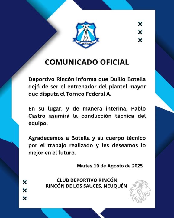 «Deportivo Rincón informa que Duilio Botella dejó de ser el entrenador del plantel mayor, que disputa el torneo Federal A», arranca con comunicado del club. «En su lugar y de manera interina, Pablo Castro asumirá la conducción técnica de equipo», sigue. Y cierra: «Agradecemos a Botella y sue cuerpo técnico por el trabajo realizado y les deseamos lo mejor en el futuro».
