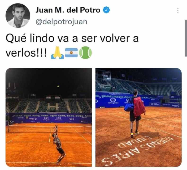 “Qué lindo va a ser volver a verlos!!!”, escribió el tenista argentino y acompañó el mensaje con dos imágenes suyas dentro de una cancha de tenis, en la previa a lo que será su esperado regreso al circuito, tal vez el martes frente a un rival que todavía no esta confirmado..