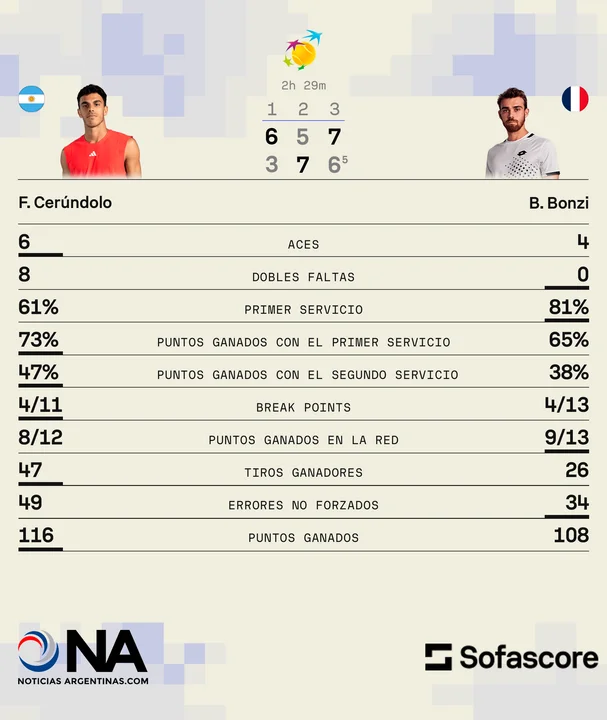Ya en el segundo, Cerúndolo logró quedarse con el servicio de su rival en el tercer game. Sin embargo, cuando sirvió 5-4 para el partido, lo cedió con una doble falta y, desde entonces, el set se le hizo cuesta arriba, con Bonzi llevándose la manga por 7-5.