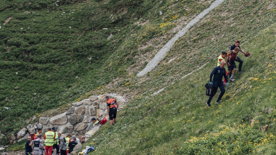 El ciclista fue encontrado «inerte en el agua» de un barranco cercano a la carretera e «inmediatamente reanimado y transportado al hospital de Coire por vía aérea», señalaron los organizadores de la carrera.