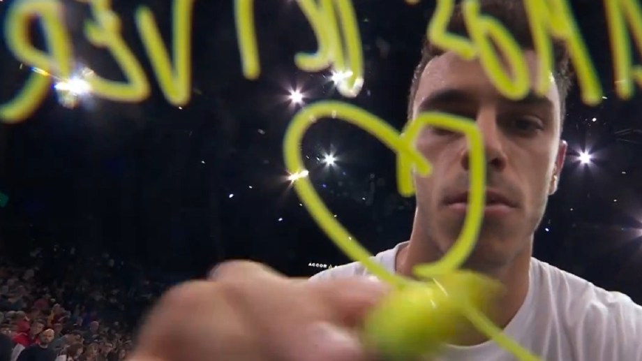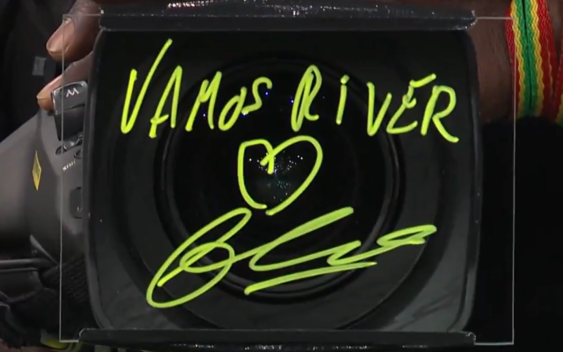 En la previa del duelo, el tenista de 26 años fue invitado a dejar un mensaje en las cámaras de televisión, como es habitual en este deporte, y sorprendió con su escrito. Sin dudarlo, escribió su firma acompañada de una breve frase para el elenco de Núñez: «Vamos River».