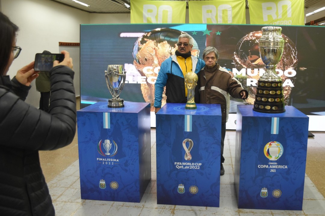 Grupos de amigos, familias, adultos, adolescentes y niños se acercaron al Cajón del Deportivo Roca para observar de cerca la Copa América, Finalissima y la del Mundo que alzó Lionel Messi en Qatar. La muestra finalizará a las 21 y luego viajará para Cipolletti y Neuquén.