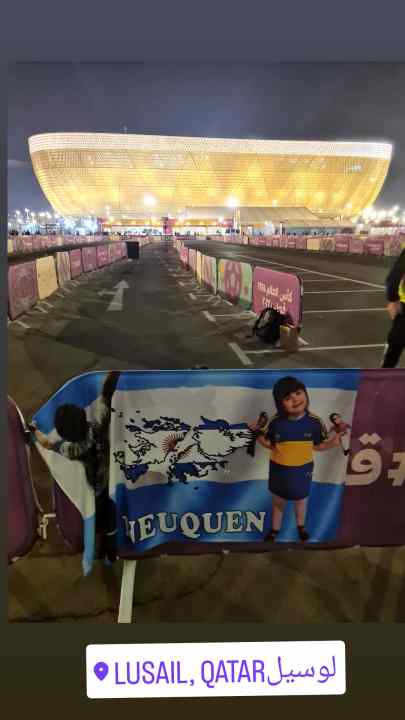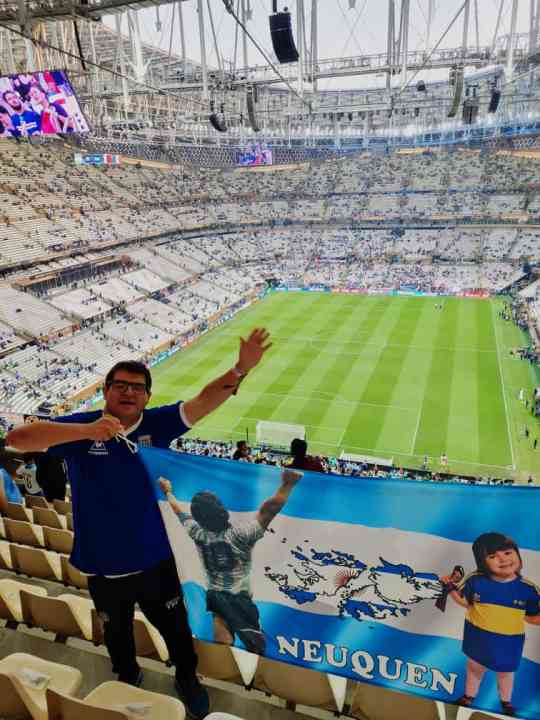 Una semana para ir por la gloria eterna al Mundial Qatar 2022 y la promesa a su hija Malvina de cinco años de que volvería con la copa. Una entrada para la semifinal comprada en 12 cuotas a unos cordobeses. Vuelo con escalas para bajar los costos. La búsqueda desesperada de un ticket luego de la exhibición contra Croacia. Mil puntas tiradas y precios delirantes: hasta 6.000 dólares le pidieron unos turcos. Una cita en un bar con hinchas de Chacarita, unos mates mientras los esperaba, los números sobre la mesa, la negociación y al fin el suspiro cuando tiene en sus manos por mucho menos dinero que le pedían los revendedores árabes el pasaporte al estadio Luisal, ese que se aprestaba a entrar a la misma categoría mítica que el Azteca. La bandera con su hija en un extremo, Maradona en el otro, las Malvinas en el medio y Neuquén abajo escondida en un bolsillo interior de la mochila. Se la requisaron contra Croacia cuando la llevaba al cuello, por las islas. «La FIFA no permite manifestaciones políticas», el argumento. «Política las pelotas hermano, son nuestras, que las devuelvan. Y vos devolveme la bandera!», gritó Mauro Gutiérrez. No hubo caso. Dos hombres de seguridad amagaron primero con tirarla a la basura y después aceptaron llevarla al depósito gracias a un marroquí que intervino para mediar, para explicar. Al final del partido la recuperó.