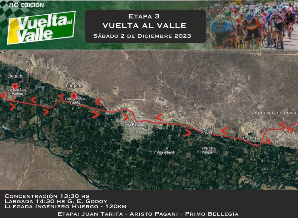 En los dos primeros giros volverán a Fernández Oro y en el tercero en vez de regresar seguirá hasta Roca por la calle Rural 4 hasta la parte más alta de Paso Córdoba donde concluirá. También abarcará 100 kilómetros, con la exigencia de la subida en Roca.