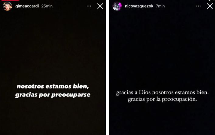 Desde las redes sociales, Nicolás Vázquez y Gimena Accardi llevaron tranquilidad y aseguraron que están bien: «Gracias a Dios estamos bien. Gracias por la preocupación», escribió él mientras que ella sumó: «Nosotros estamos bien, gracias por la preocupación».