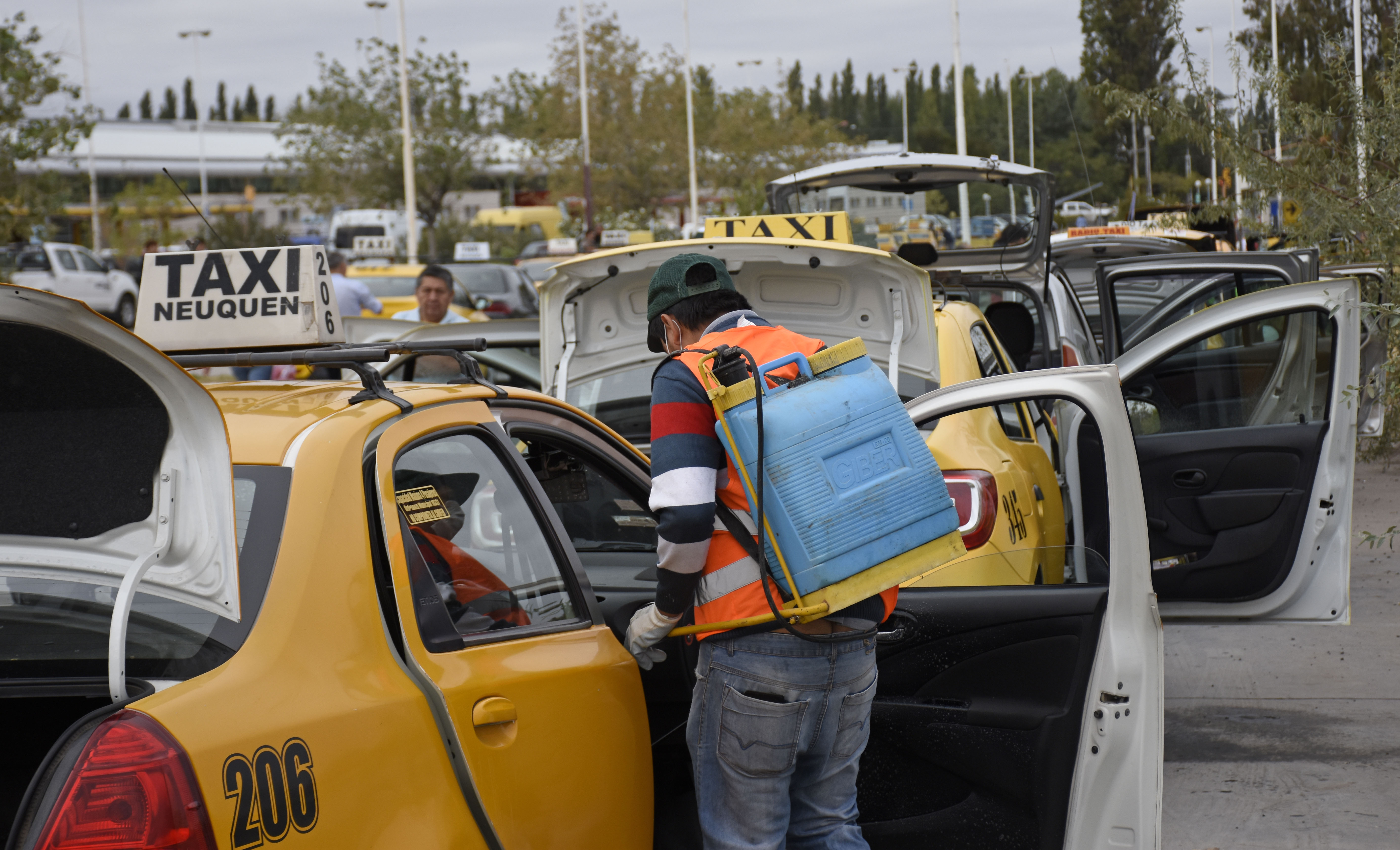 Hoy comenzó la desinfección de taxis y remisses. Para las 10 de la mañana, más de 150 unidades de transporte privado habían sido fumigados (cabina, puertas, maleteros) en la Estación Terminal de Omnibus de Neuquén.