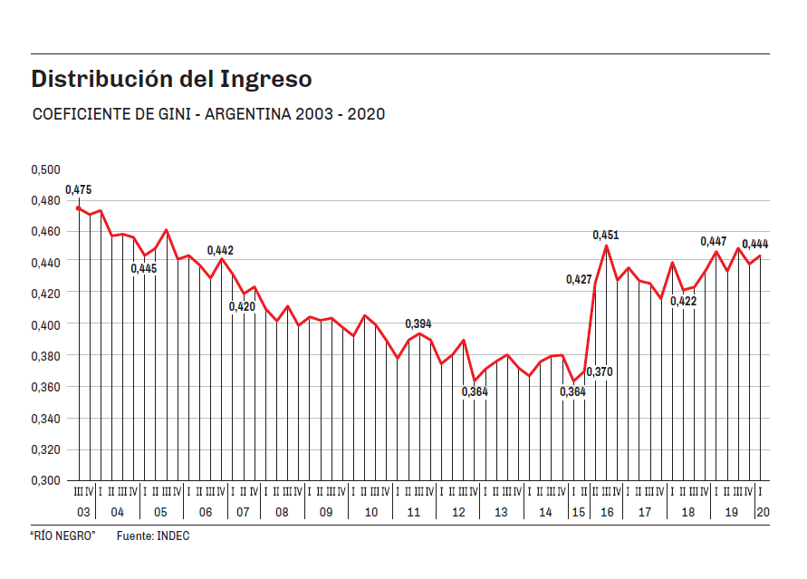 El segundo gráfico que acompaña la nota, muestra la evolución del Coeficiente de Gini en Argentina desde el tercer trimestre de 2003 hasta el primer trimestre de 2020. Se advierte que la distribución más desigual se registra a la salida de la crisis de 2001, para luego ir mejorando progresiva y sensiblemente, alcanzando el mejor registro (0,364) en el tercer trimestre de 2012. Los críticos podrán señalar que los datos oficiales son cuestionables luego de la intervención del INDEC a mediados de 2007. No obstante para ese entonces, el Gini ya mostraba una sensible mejora con un registro de 0,42. La serie muestra hacia mediados de 2015 un ratio de 0,37, y un salto hasta 0,451 a mediados de 2016, culminando a fines de 2019 en 0,439. El dato más reciente, dice que en el primer trimestre de 2020, el Gini es de 0,444. Implica una distribución más desigual que a fines de 2019, y equipara el registro de finales del año 2006, lo que significa catorce años perdidos en relación a la mejora en la distribución.
